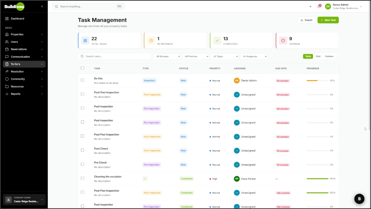 Schedule and track maintenance tasks with assignments, due dates, and completion tracking.